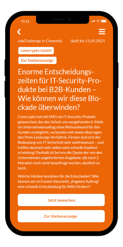 Mit Ihrer JobChallenge bilden Sie eine Aufgabe aus dem Arbeitsalltag der zu besetzenden Position ab. So erfahren Kandidat*innen bereits vorab, welche Aufgaben sie erwarten. Das weckt zum einen das Interesse passender Kandidat*innen und sorgt zum anderen für einen hohen Person-Job-Fit.